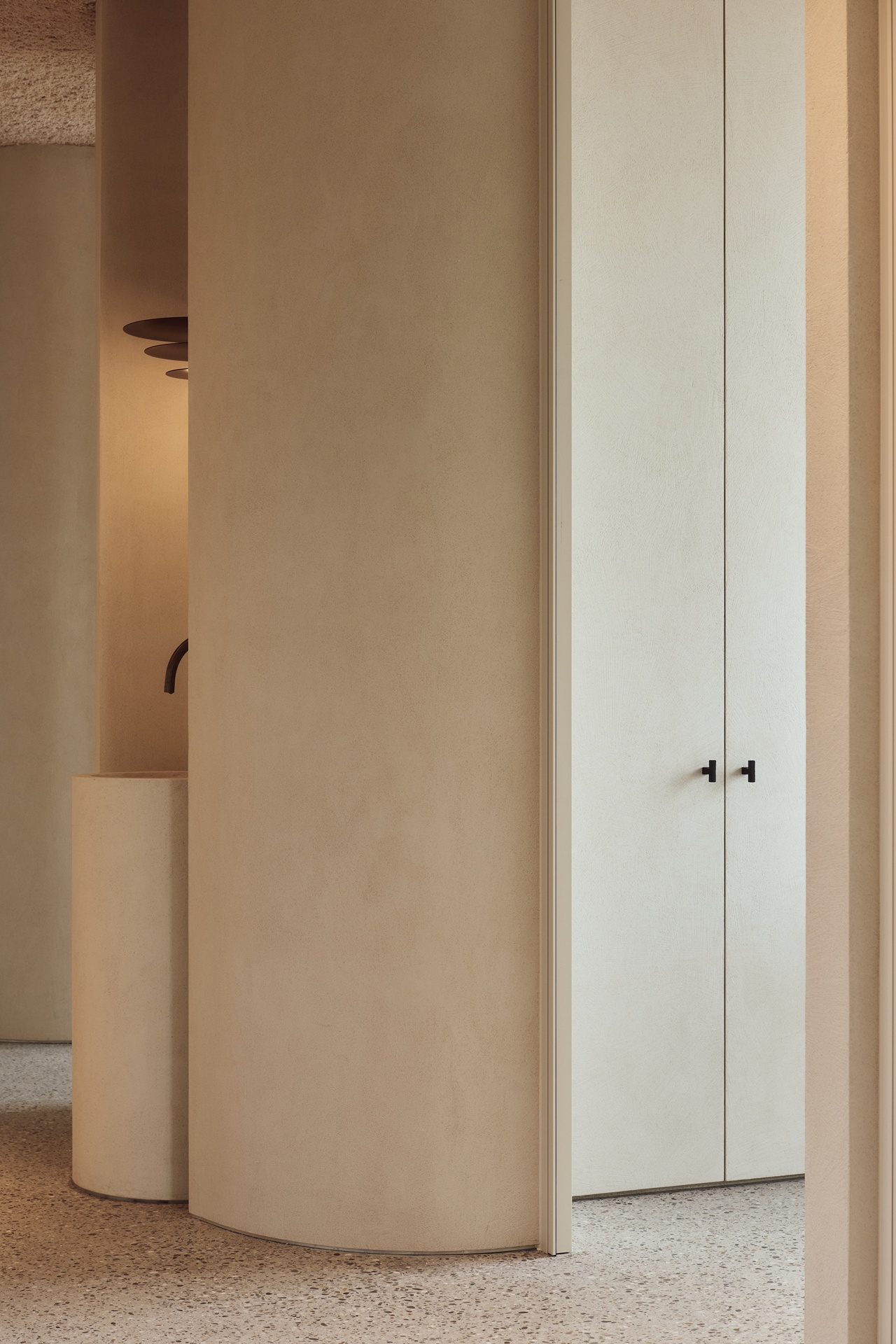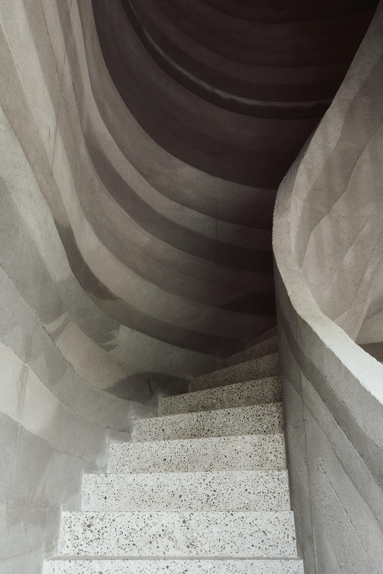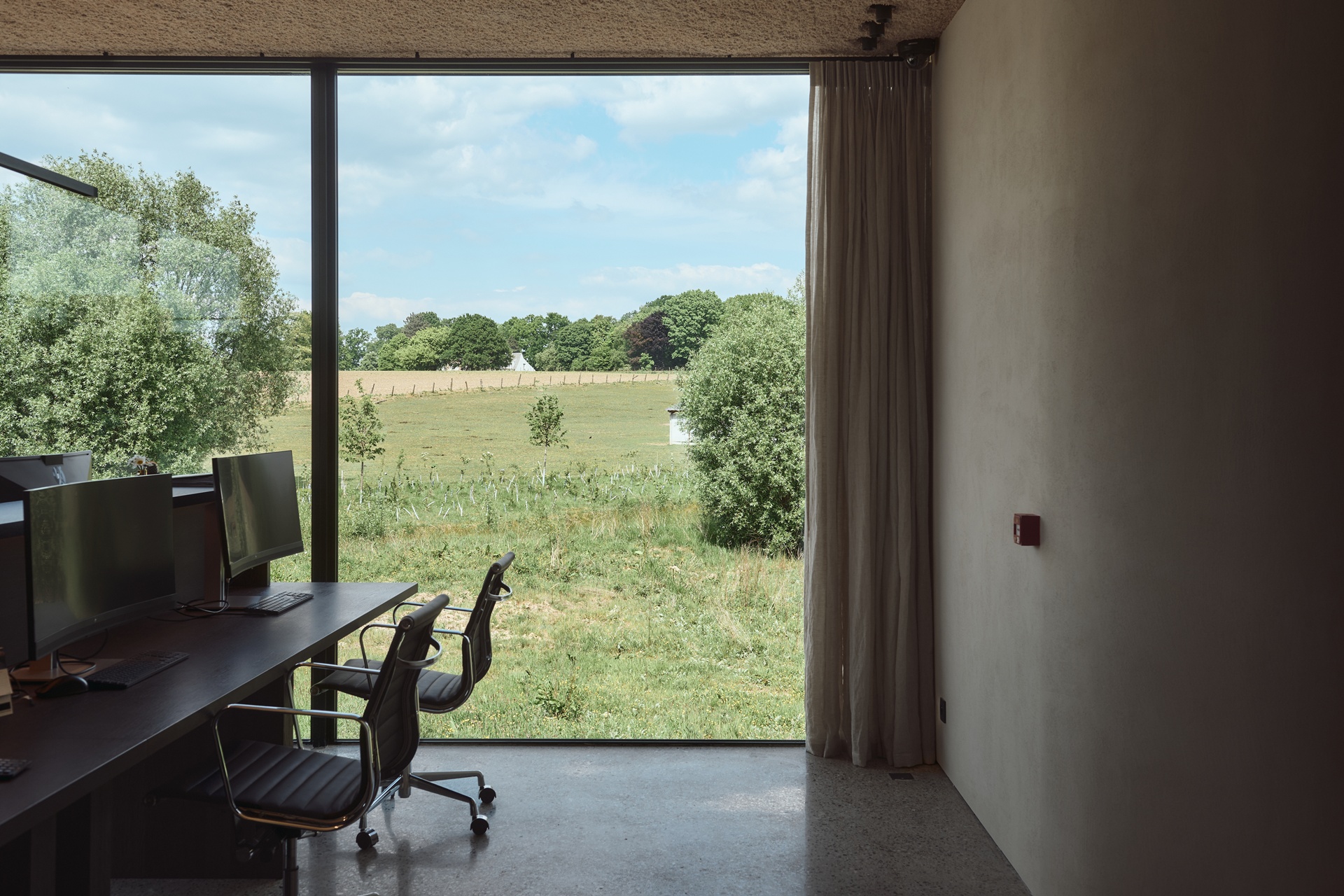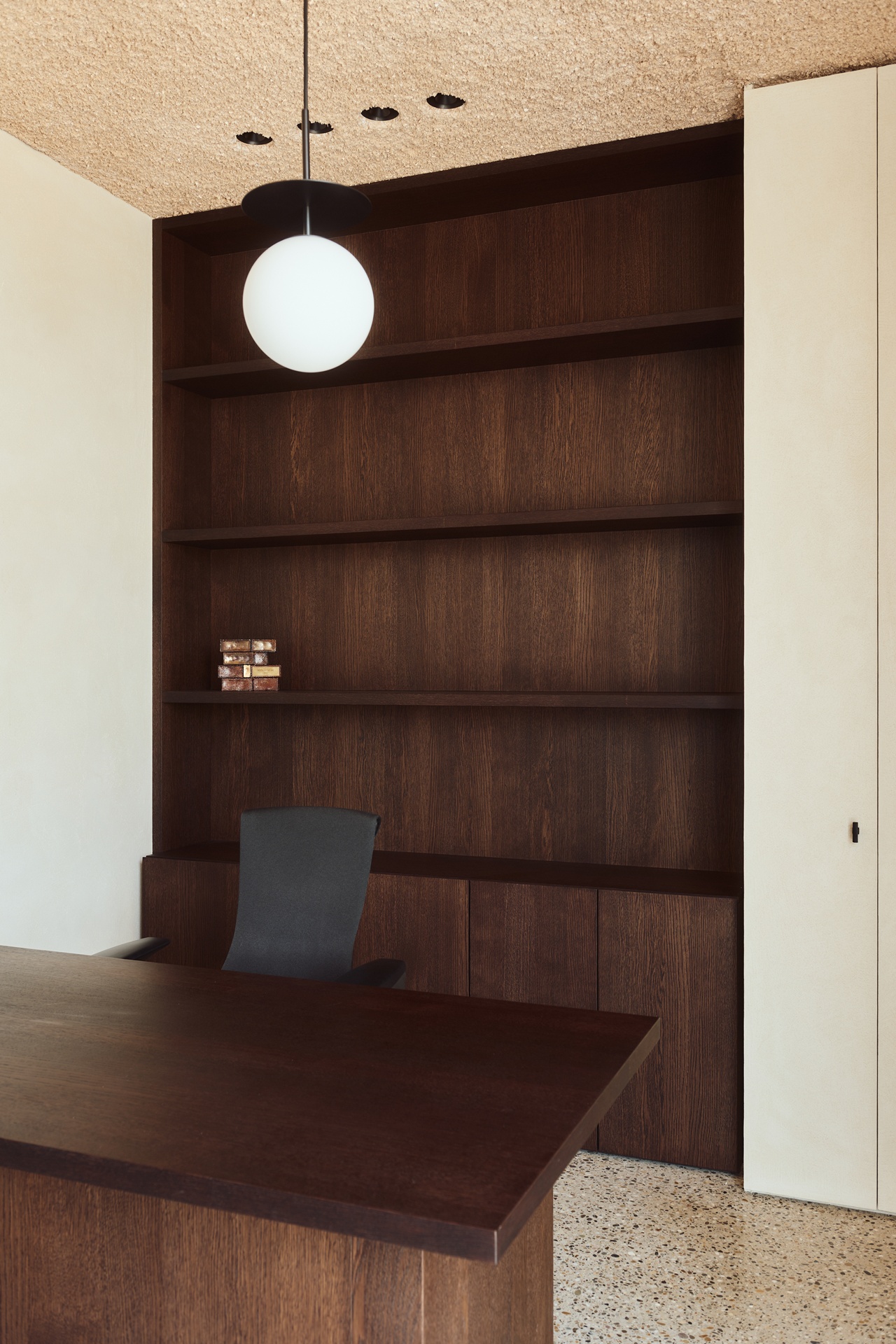 Het interieur is perfect afgestemd op de architecturale context: terrazzo gietvloeren, zichtbeton en mortex muren creëren een krachtig samenspel van texturen. Beige stofferingen maken het geheel af en brengen warmte in het industriële kader. Dit project toont hoe slimme materiaalkeuzes en precisie in uitvoering leiden tot een doordachte, comfortabele werkomgeving met karakter.