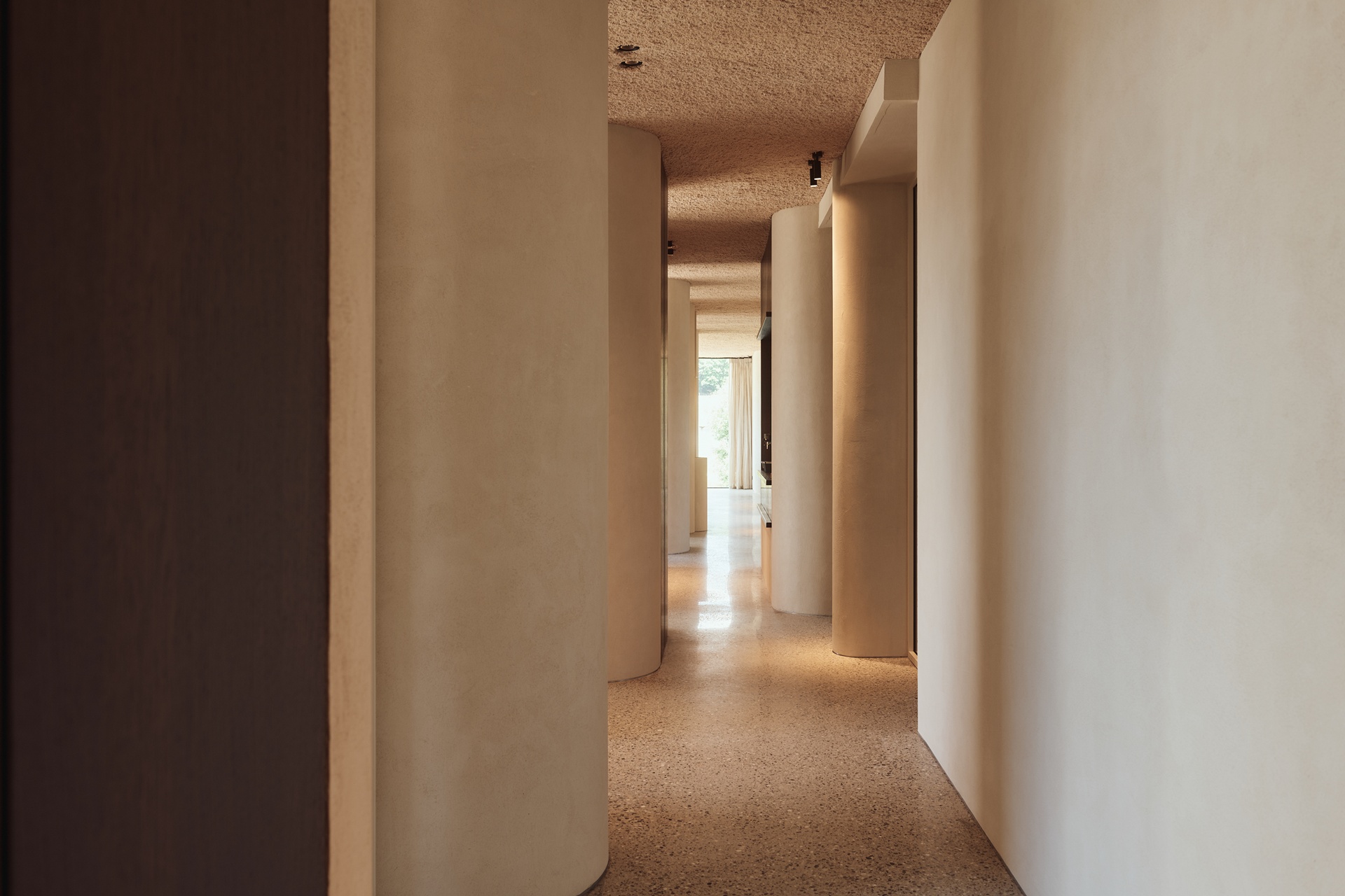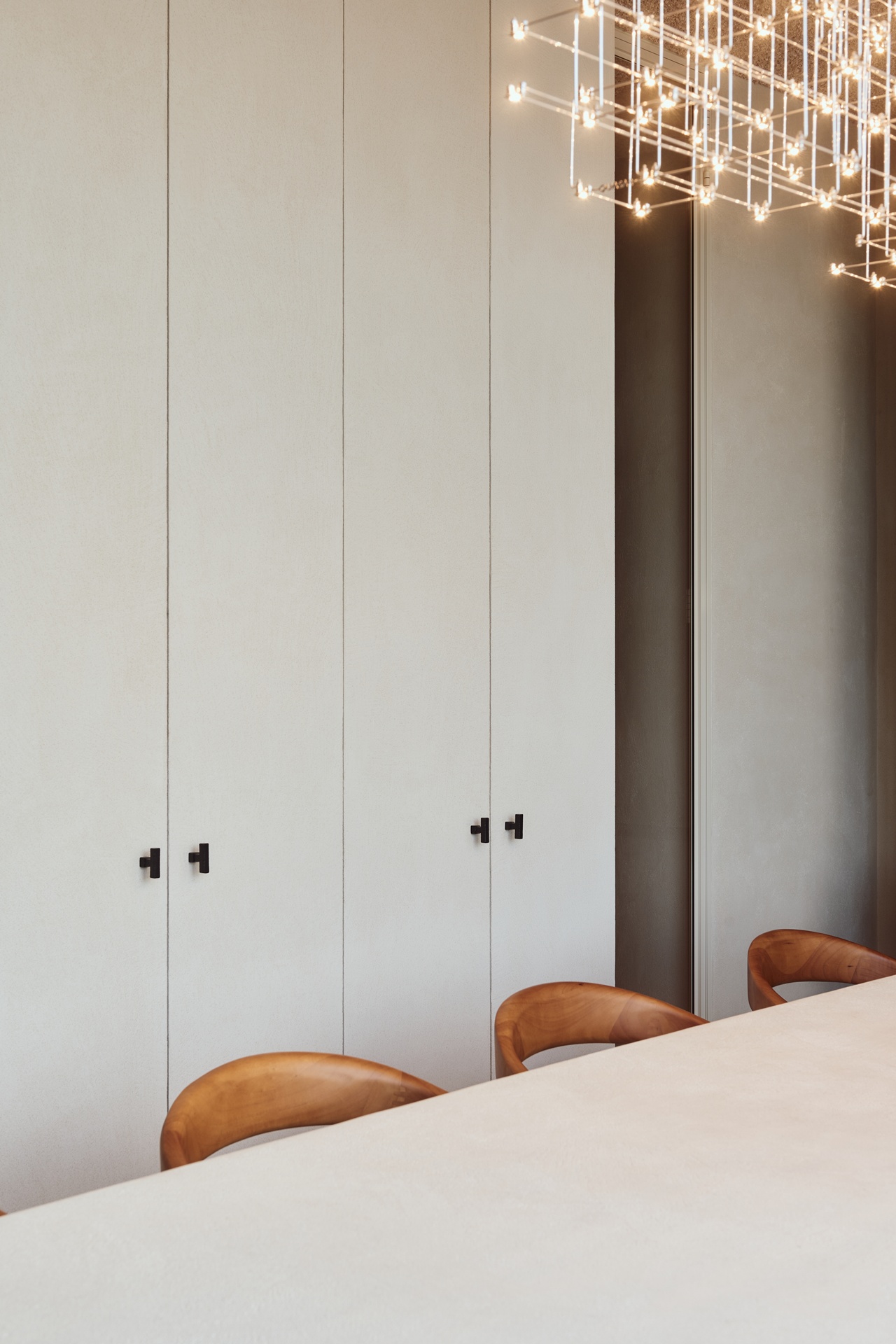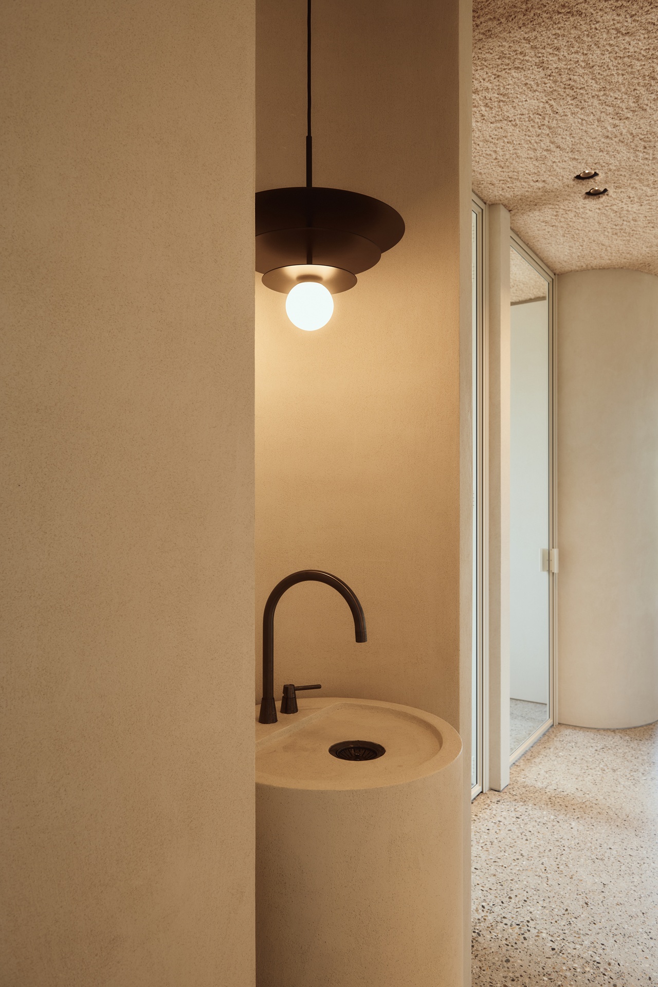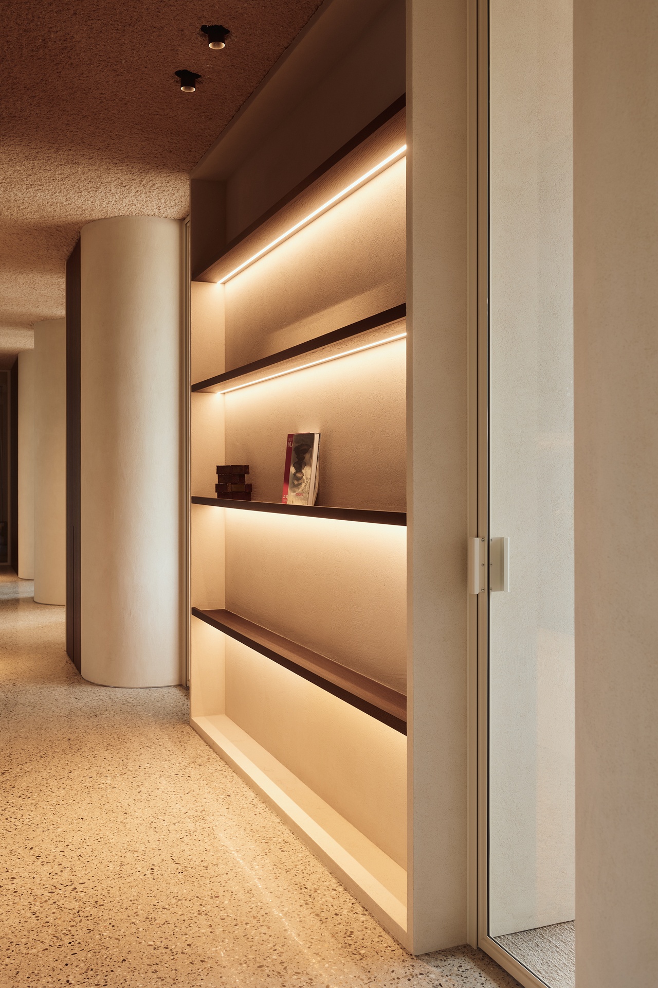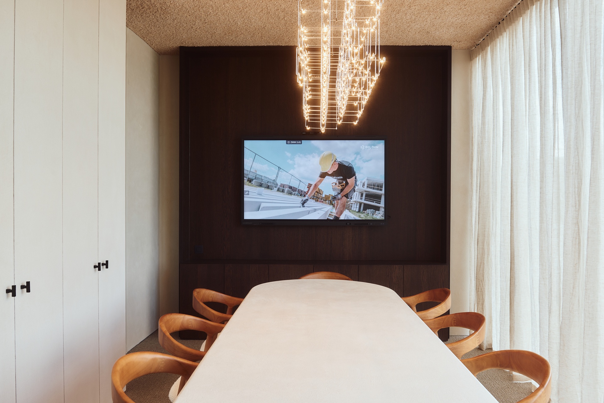 Het interieur is perfect afgestemd op de architecturale context: terrazzo gietvloeren, zichtbeton en mortex muren creëren een krachtig samenspel van texturen. Beige stofferingen maken het geheel af en brengen warmte in het industriële kader. Dit project toont hoe slimme materiaalkeuzes en precisie in uitvoering leiden tot een doordachte, comfortabele werkomgeving met karakter.