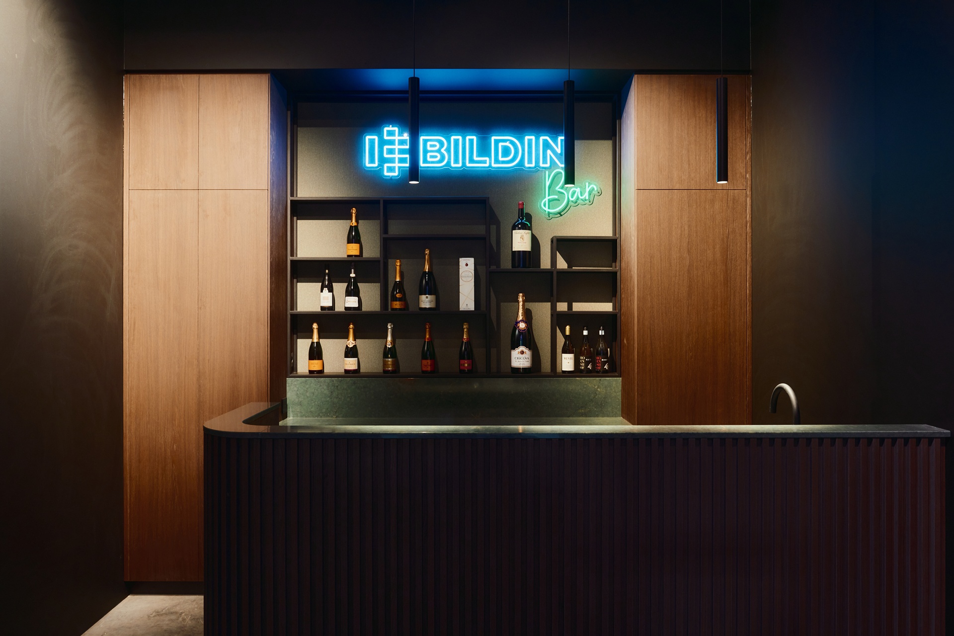 Stijlvol maatwerkinterieur voor de kantoren van Bildin: fineer, lambrisering en bar in harmonie met beton en terrazzo