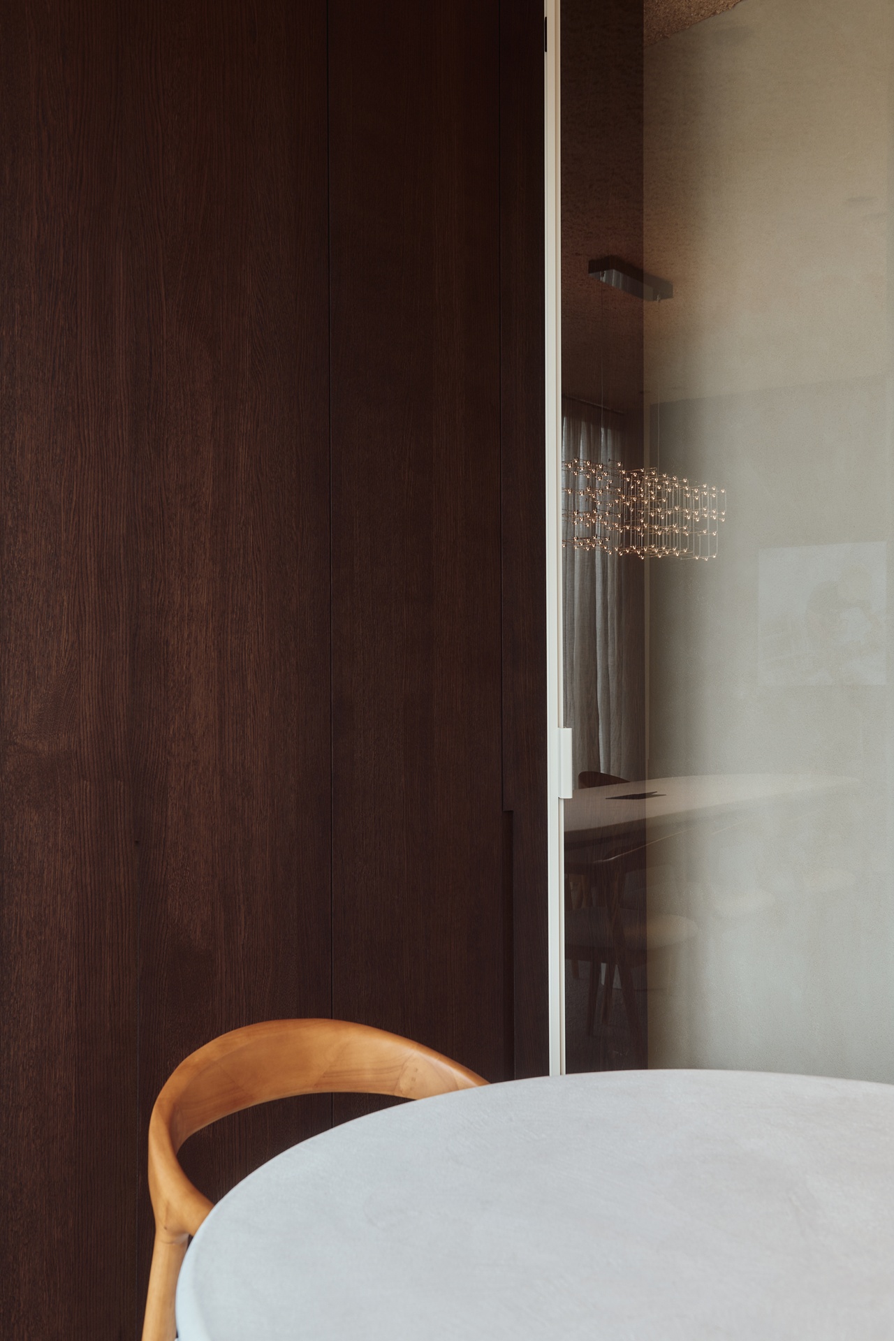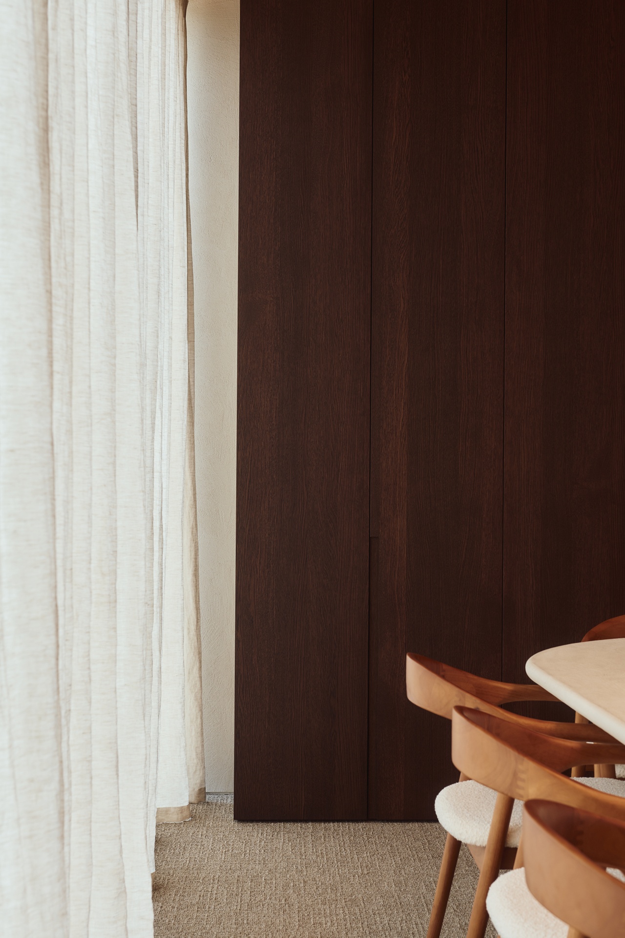 In de nieuwe kantoren van Bildin te Ternat komt elk materiaal tot zijn recht. KM Interieur realiseerde een tijdloos maatwerkconcept ontworpen door Walravens Weets Architecten dat rust en verfijning uitstraalt. Donker gebeitste fineer domineert de ruimte in de vorm van strakke kastenwanden, burelen en  lambriseringen. De sobere elegantie van deze elementen wordt versterkt door bleke accenten die zorgen voor licht en contrast.