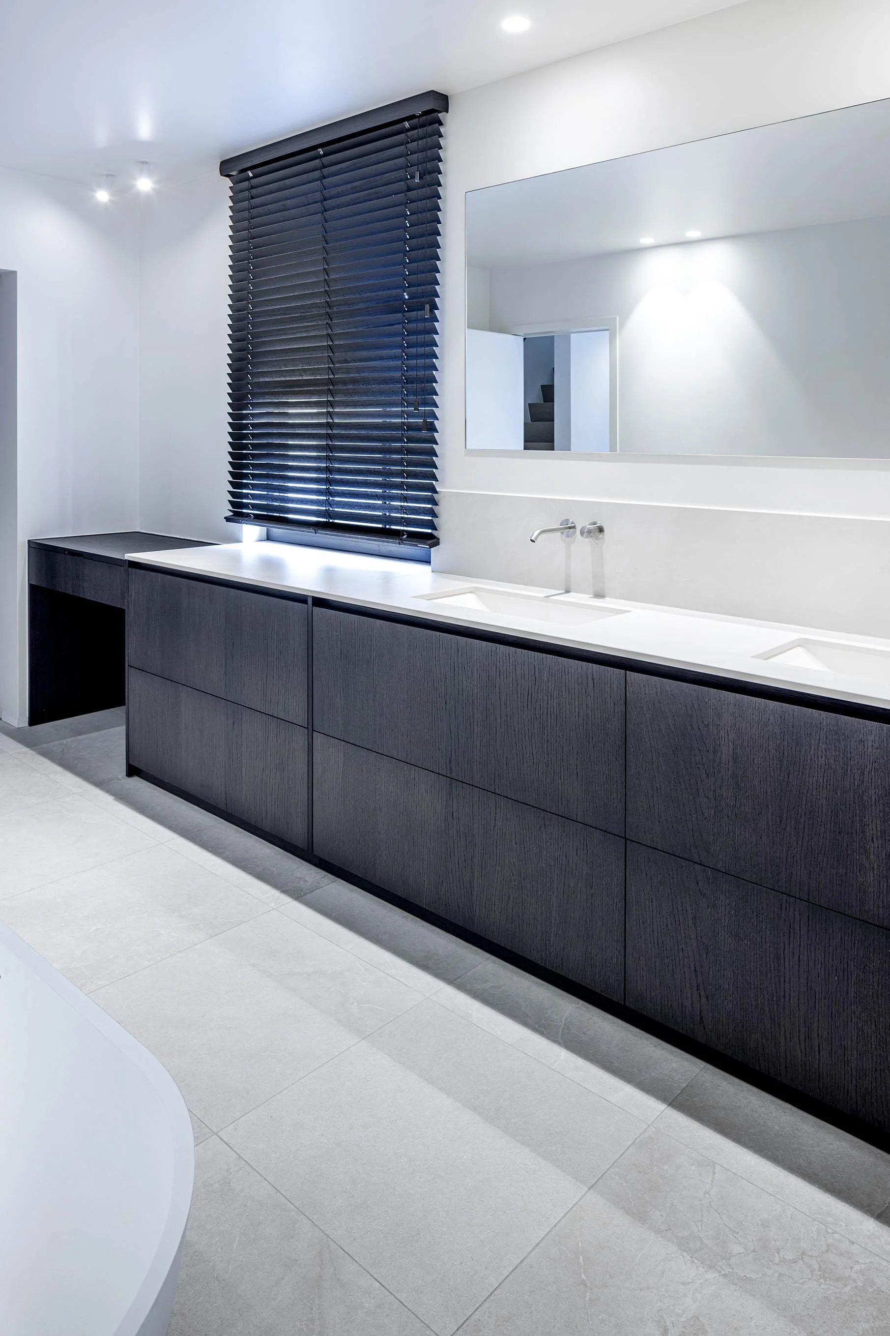 Misschien wil je een regendouche met een ingebouwde nis voor je spullen. Of een dubbele wastafel zodat jullie niet in elkaars weg lopen. Of misschien een ligbad onder een dakraam, met kastruimte verstopt in de wanden. Wij tekenen uit wat past bij hoe jij die ruimte beleeft, en we bouwen het zo dat het klopt tot in de voeg.